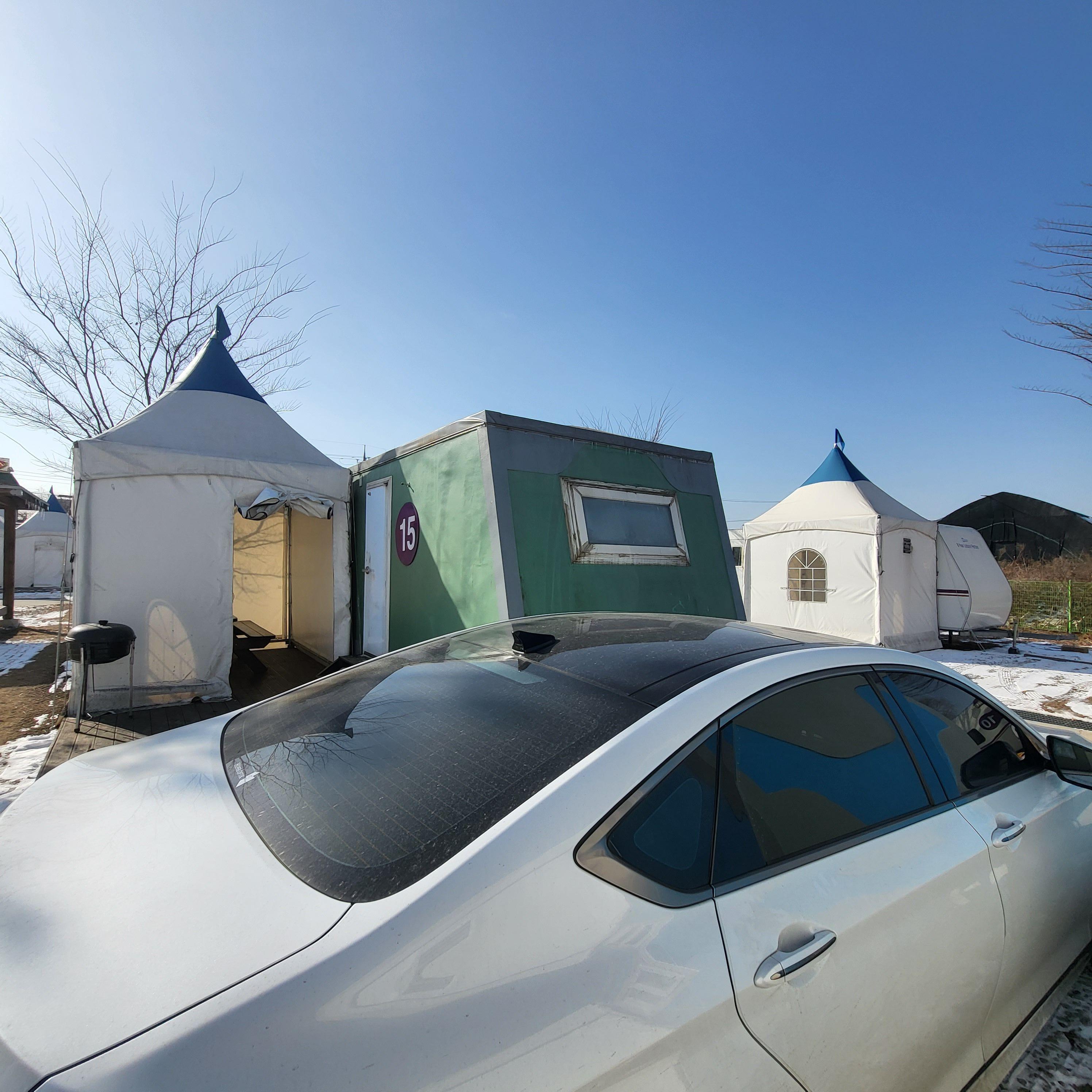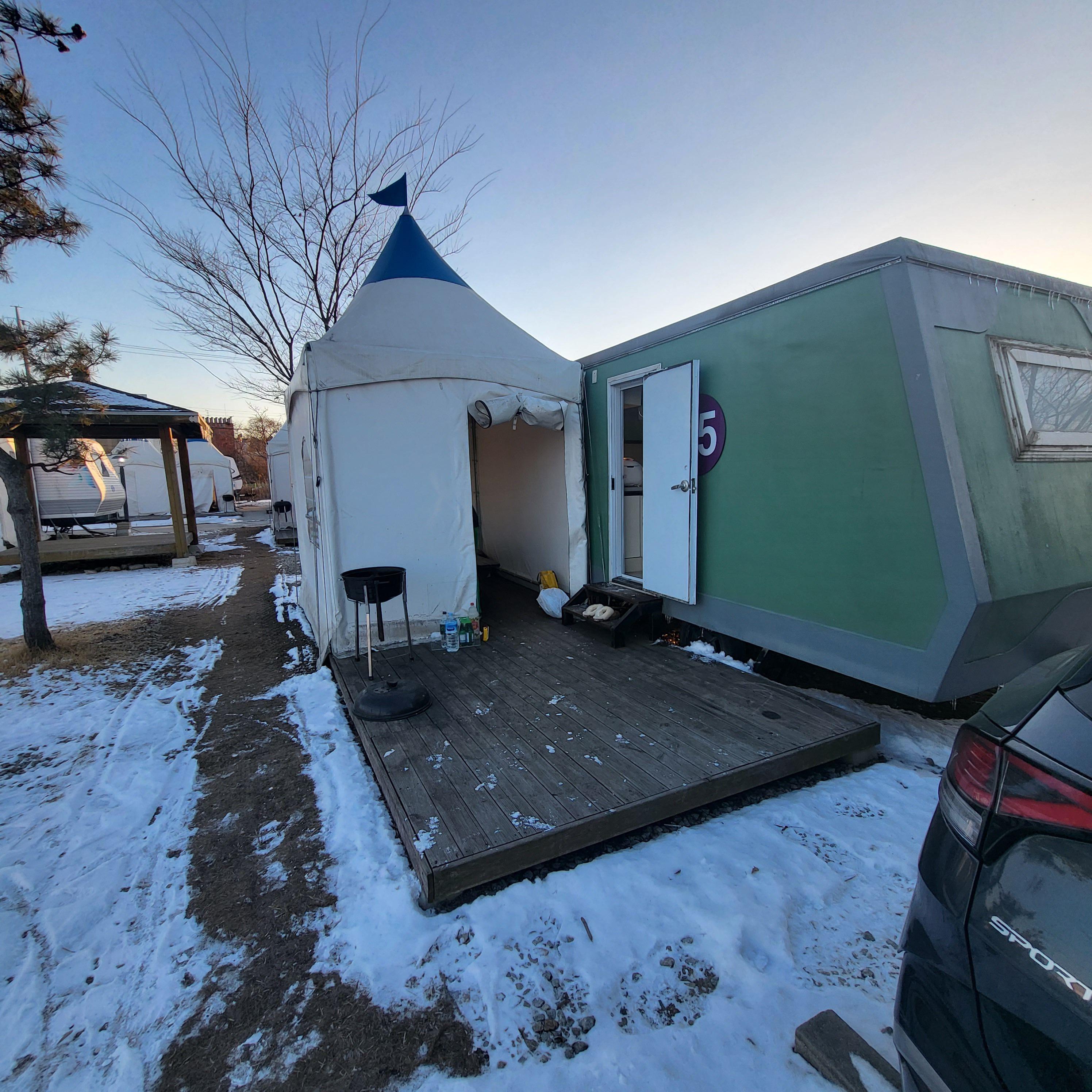 숯불은 카라반마다 옆에 천막으로 개별캠핑 할 수 있도록 되어있어서 좋았습니다.