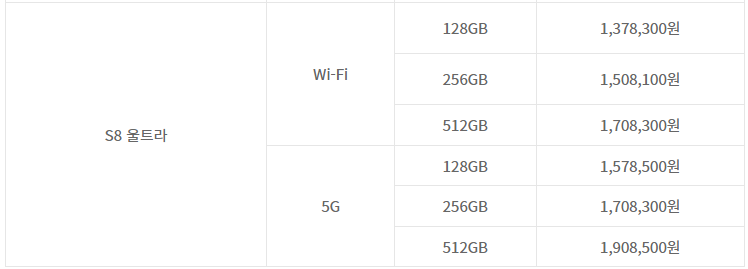 삼성전자 갤럭시탭 S8 ULTRA 256GB 출고가는 1,228,700 원 이였는데요,