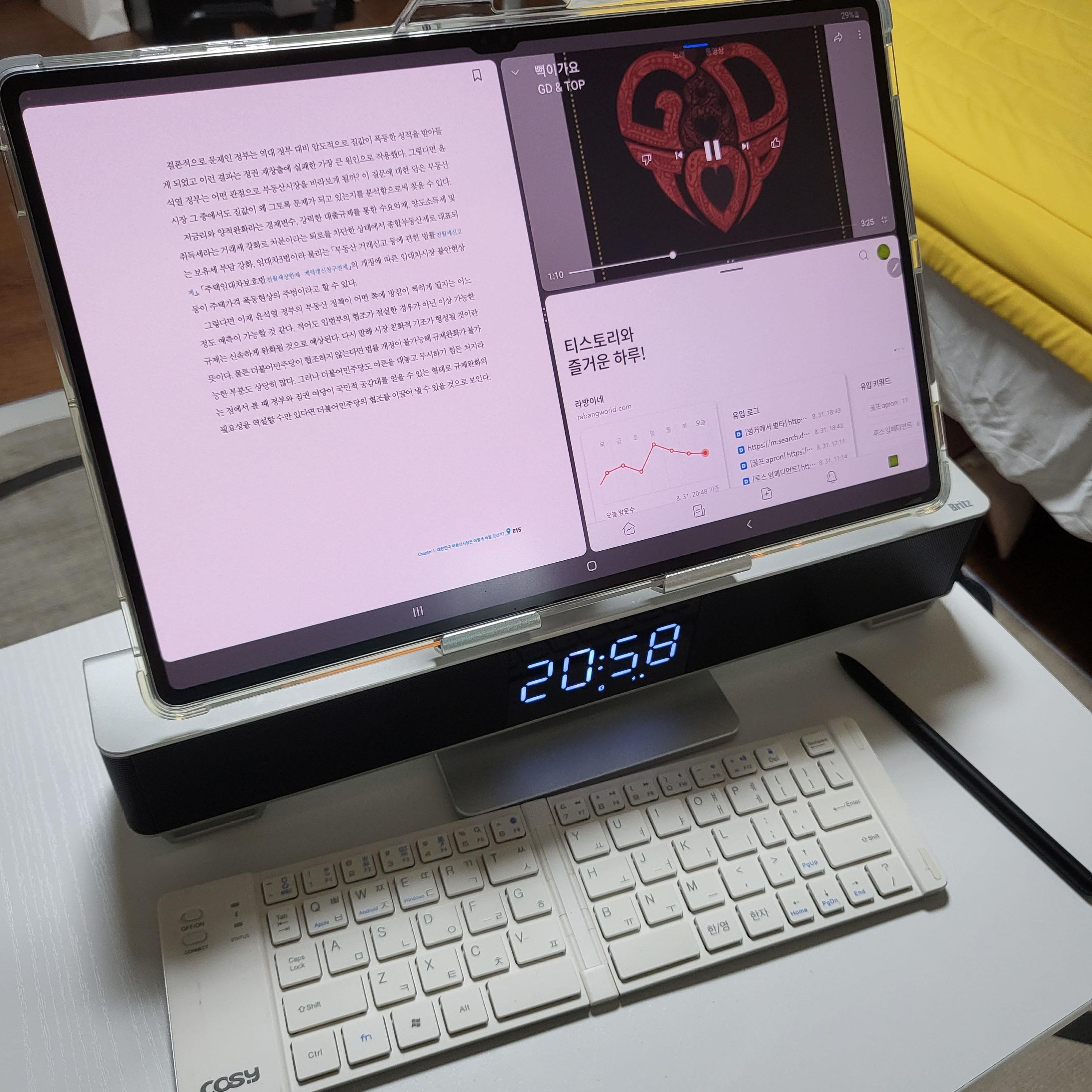 유튜브를 틀고 책도 볼수 있구 인터넷서핑이나 웹툰 등등 멀티를 한 화면에서 3개까지 자유롭게 늘였다 줄였다 사용이 가능합니다.