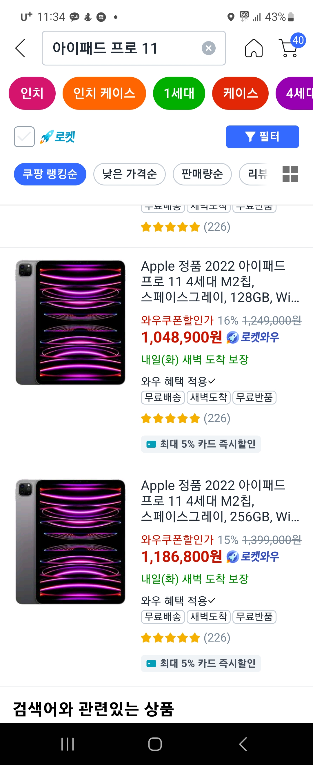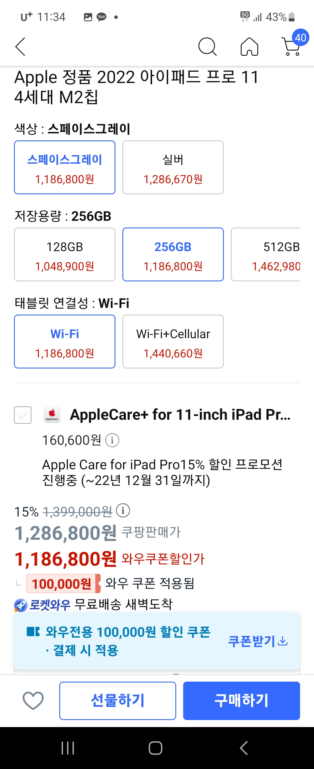 아이패드 프로 11 4세대 와이파이 256GB 는 1,186,800원입니다. 로켓배송이구요.