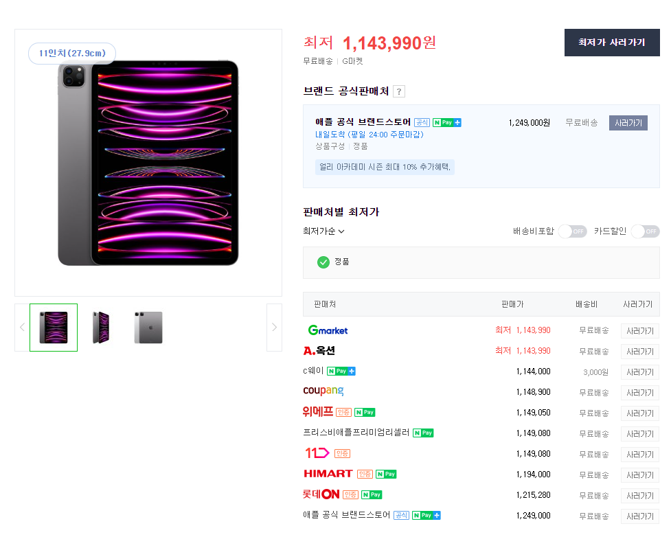 아이패드 프로 11 4세대 와이파이 128GB 기준으로 1,143,990원 입니다. 무료배송이구요