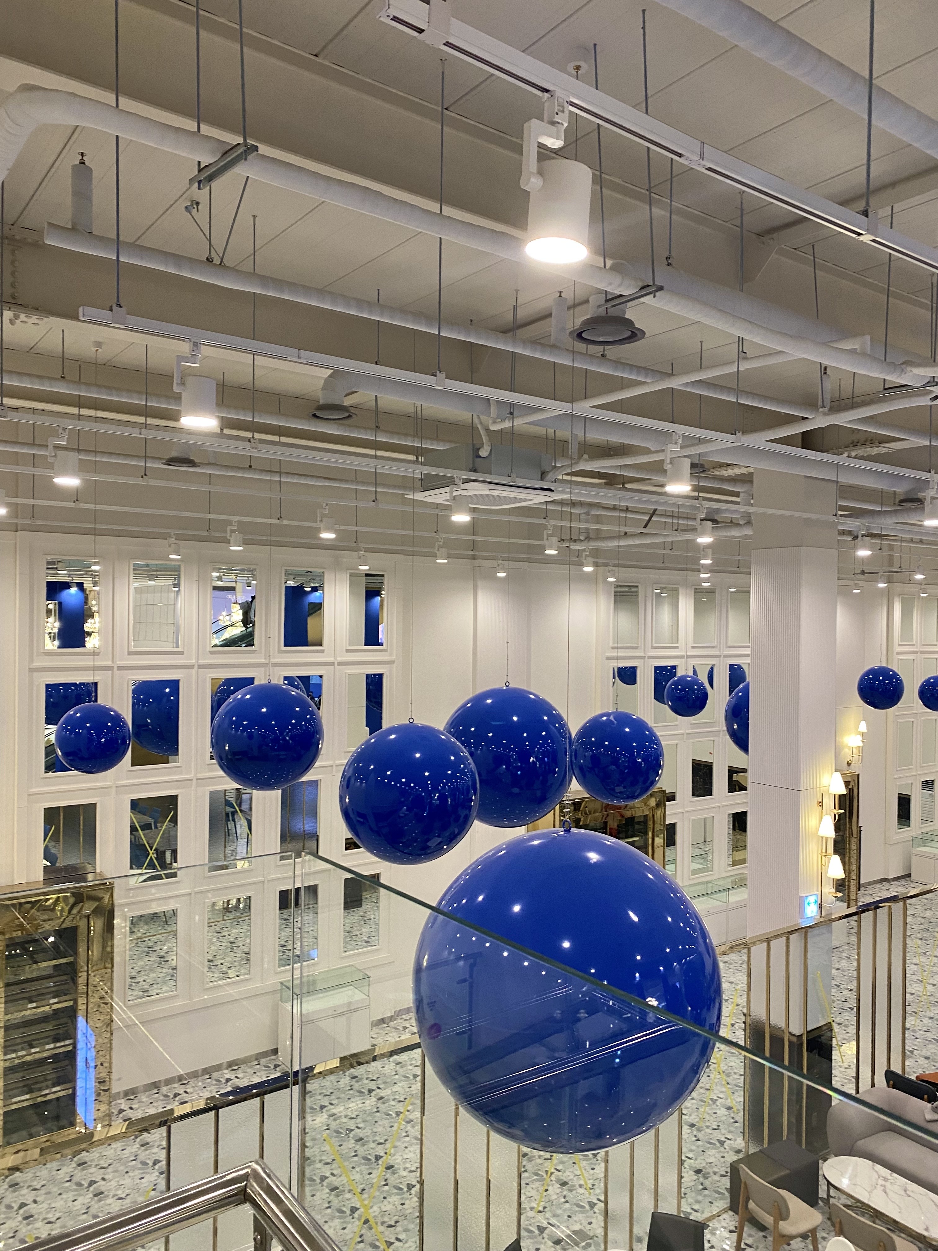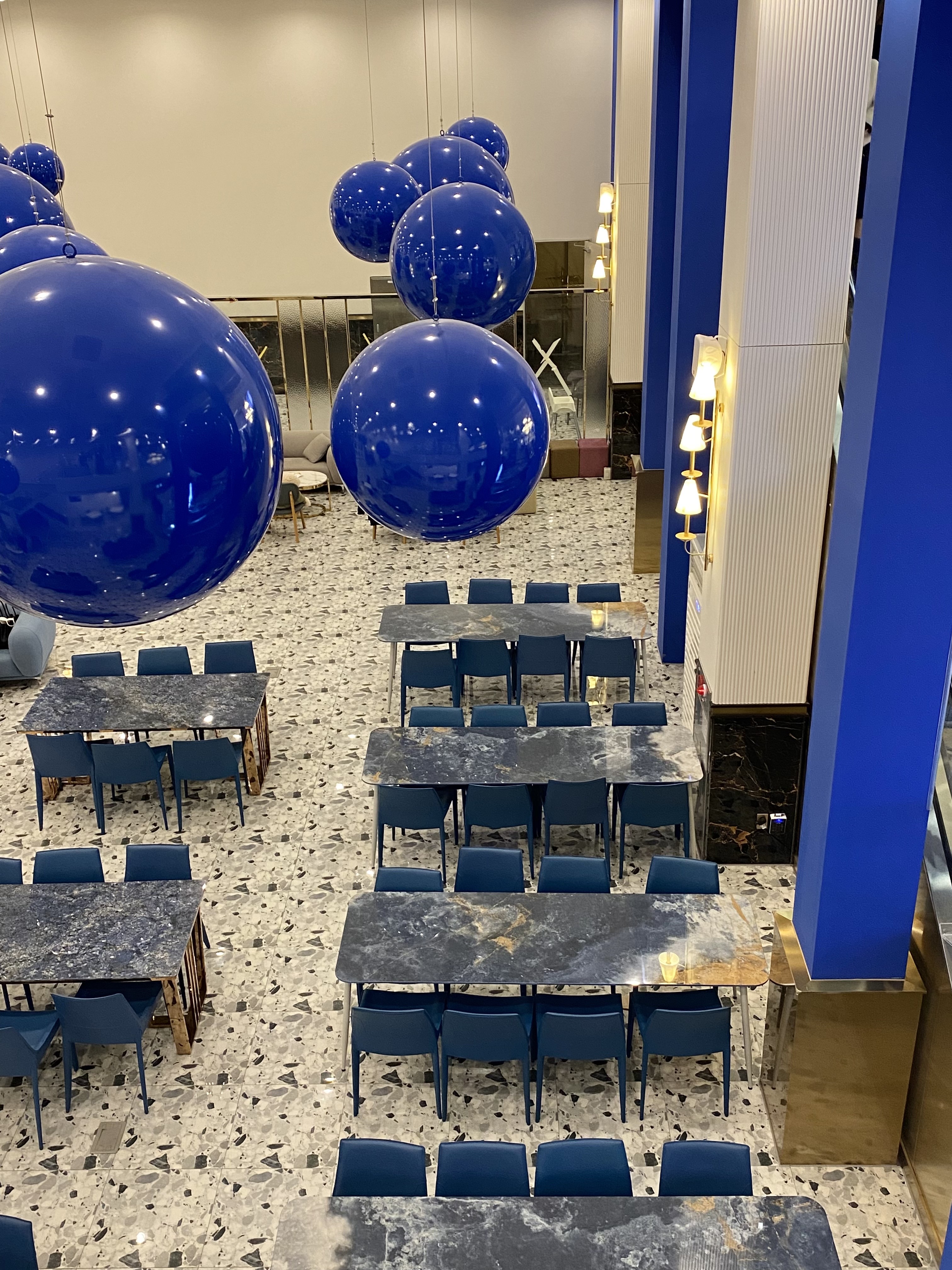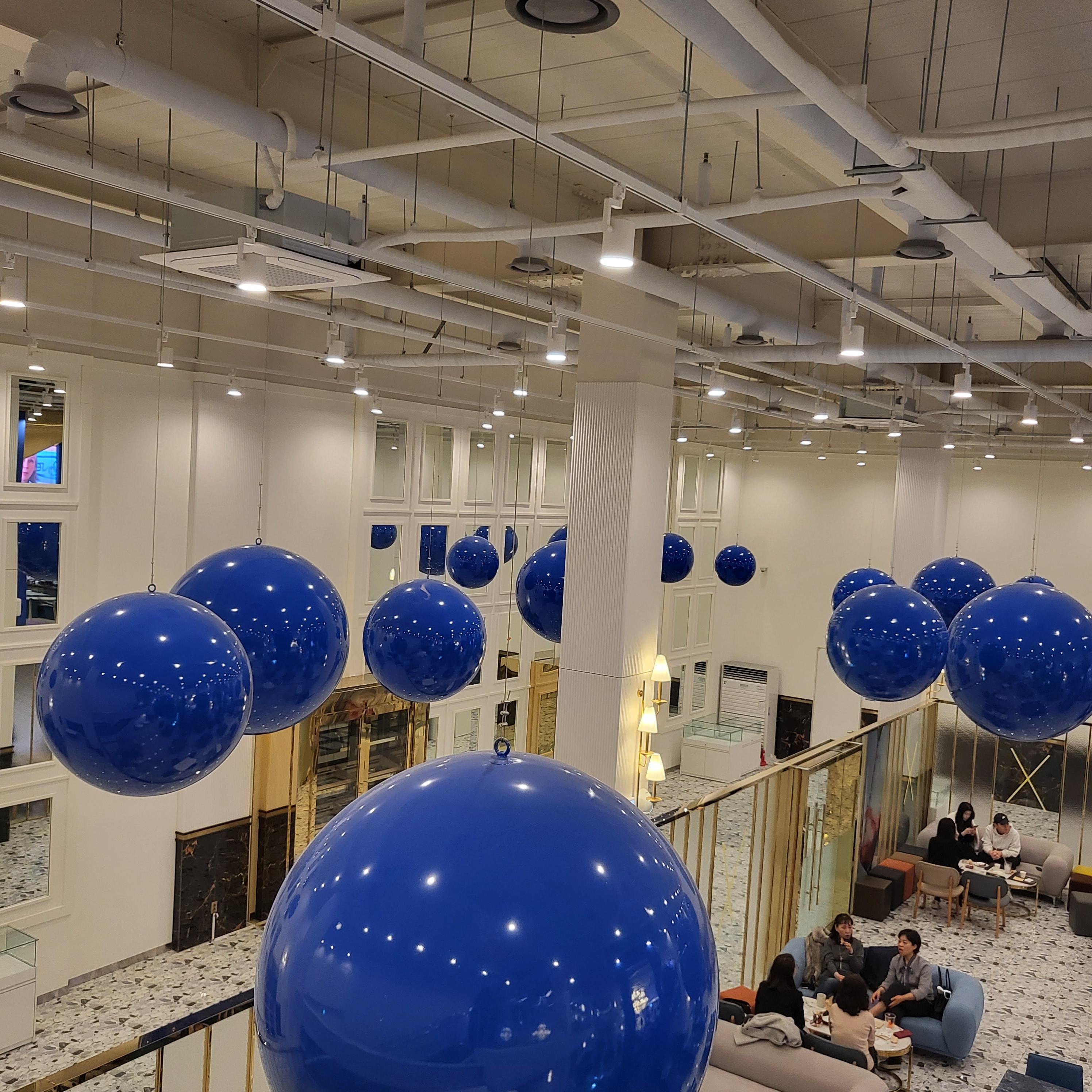 딥블루 컬러의 공들이 공중에 있는 컨셉은 또 다른 카페를 온 것 같은 느낌을 받았어요