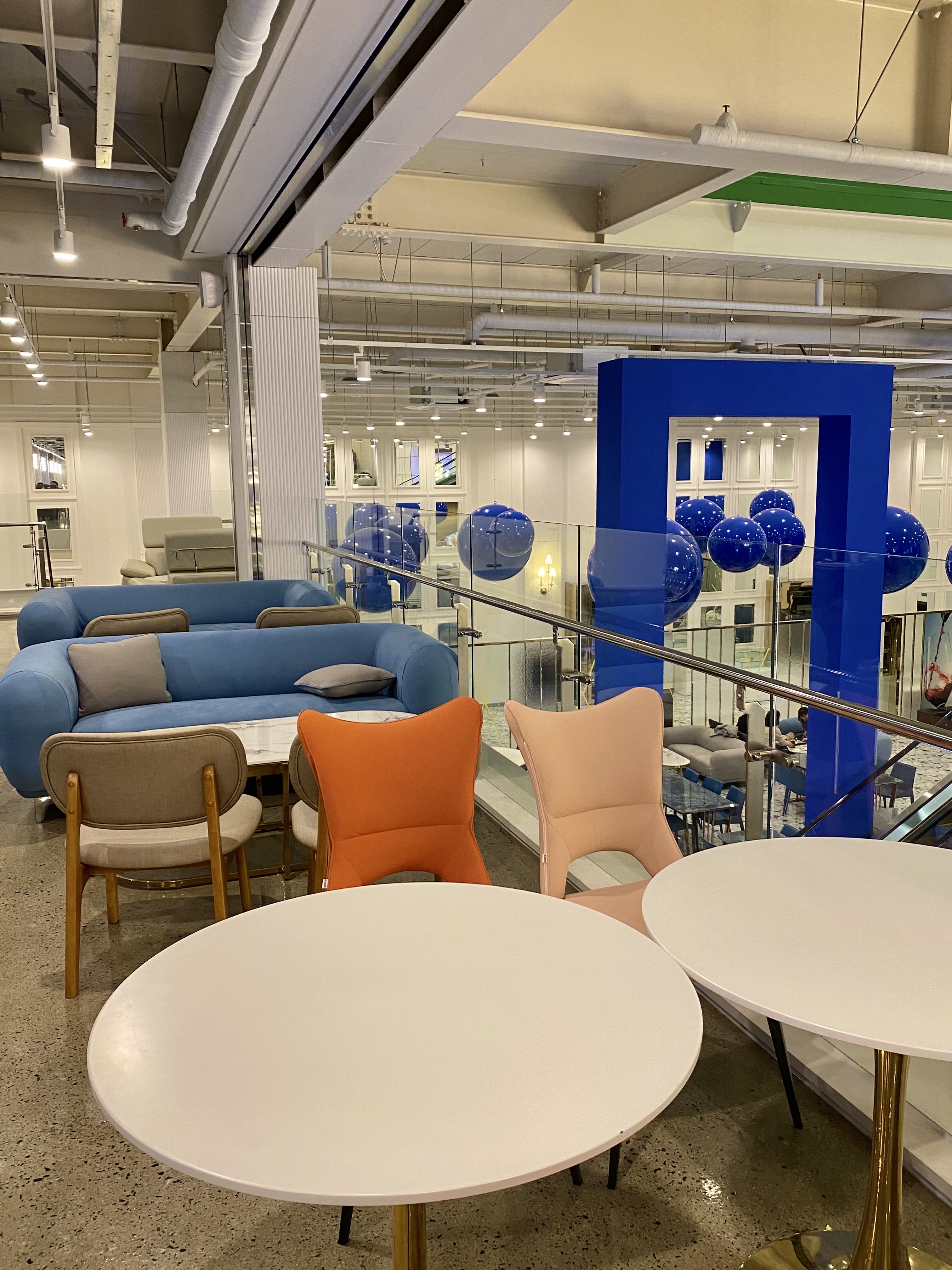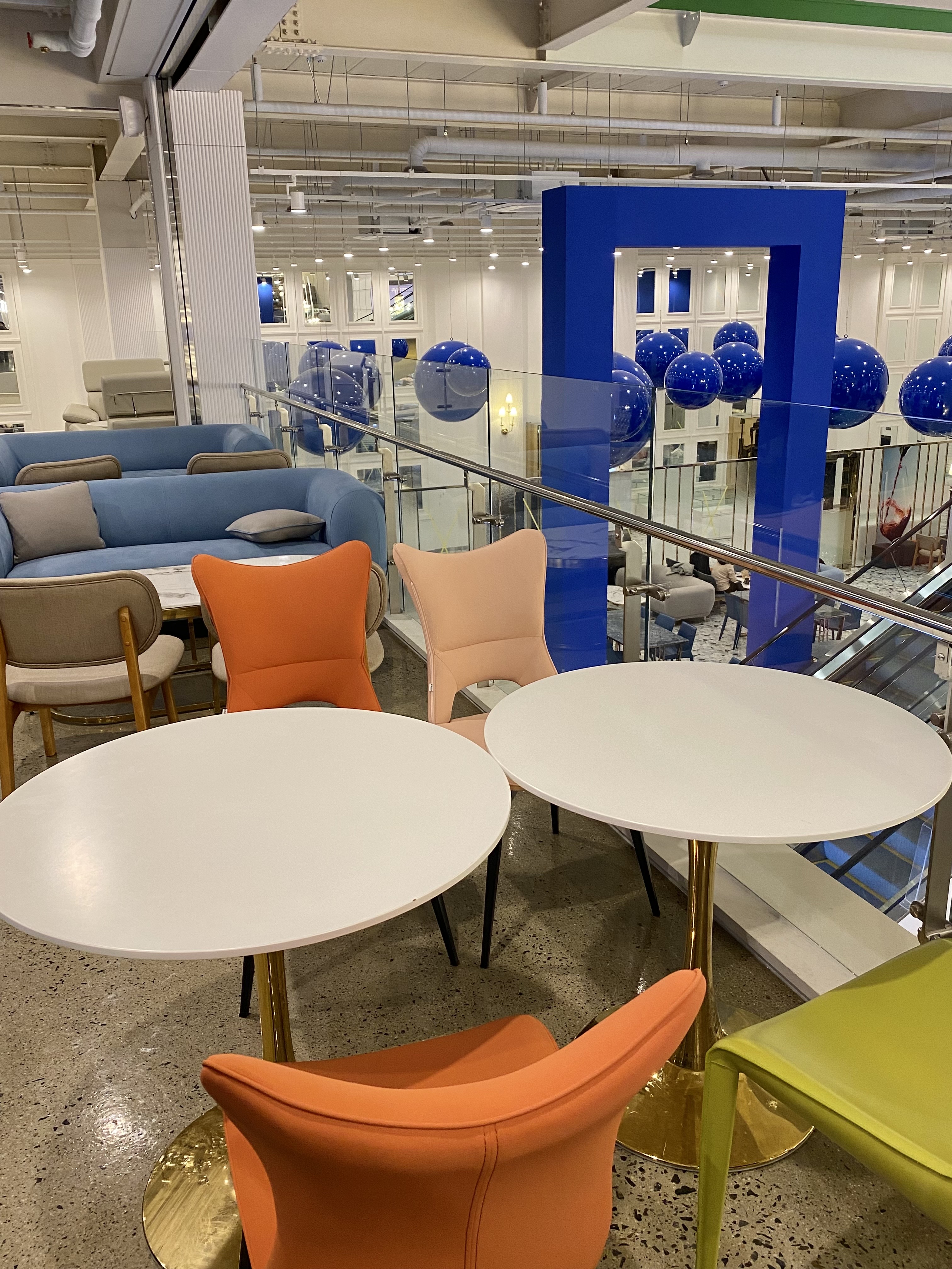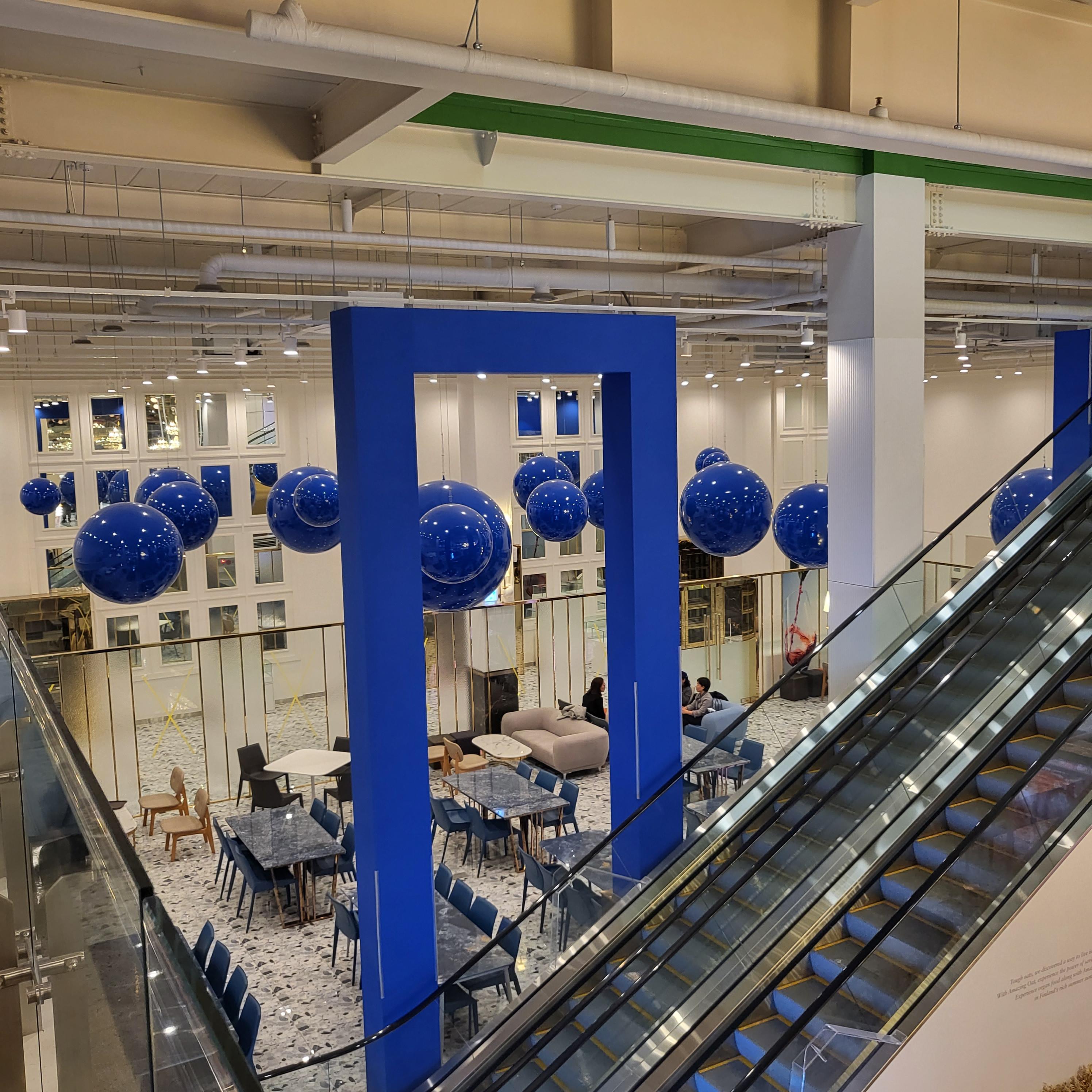 딥블루 컬러의 공들이 공중에 있는 컨셉은 또 다른 카페를 온 것 같은 느낌을 받았어요