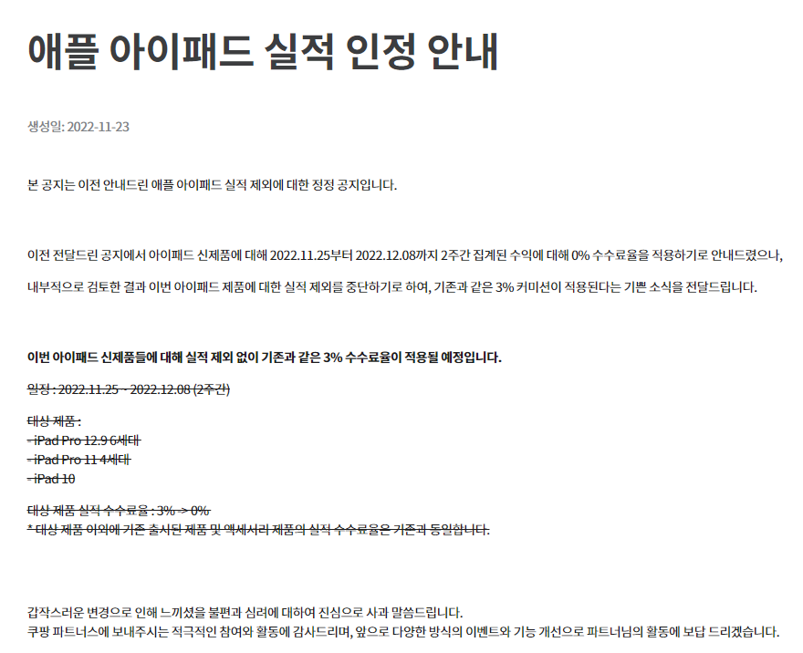 22년 11월 공지 아이패드 pro11 4세대에 대한 쿠팡파트너스의 실적 인정 안내입니다.